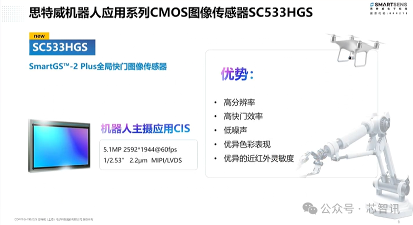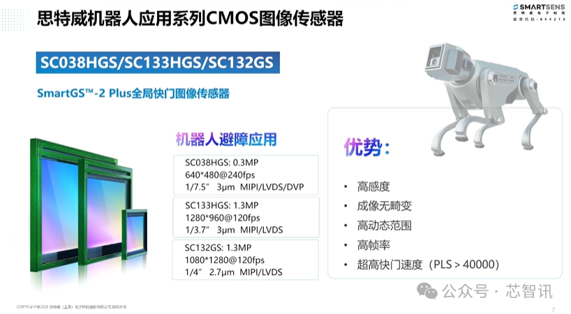 此外,思特威此前已经推出的基于SmartGST - 2 Plus全局快门图像传感器SC038HGS/SC1 33HGS/SC132GS也是面向机器人应用的一系列产品,同样具备高感度、成像无畸变、高动态范围、高帧率、超高快门速度等优势。