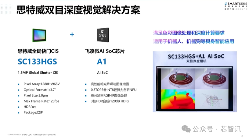 值得一提的是,思特威旗下的AI芯片子公司飞凌微推出的AI SoC A1与思特威全局快门CMOS图像传感器SC133HGS组合可以提供双目深度视觉解决方案,可以满足色彩图像处理和深度计算要求,可适用于机器人、机器狗等具身智能应用。