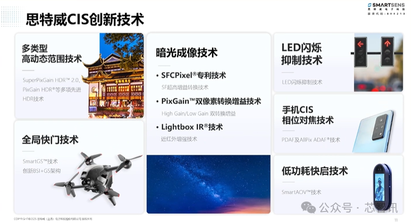 在创新技术方面,思特威也有非常多的积累,包括多类型高动态范围技术,是全球范围内仅有的三家供应商之一。还有暗光成像技术、全局快门技术、LED闪烁抑制技术、手机CIS相位对焦技术、低功耗快速启动技术等。
