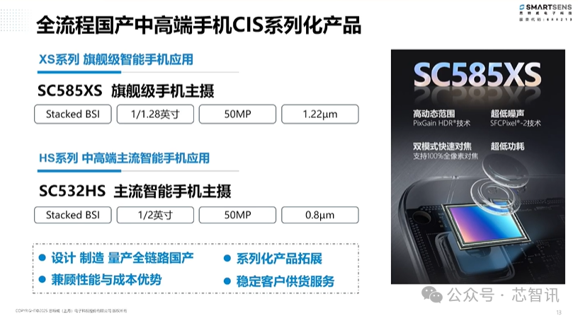 此外,在近年来国产化的大背景之下,思特微还推出了一个全流程国产化中高端手机CIS系列,首款产品是5000万像素的SC585XS,主要面向旗舰手机主摄。