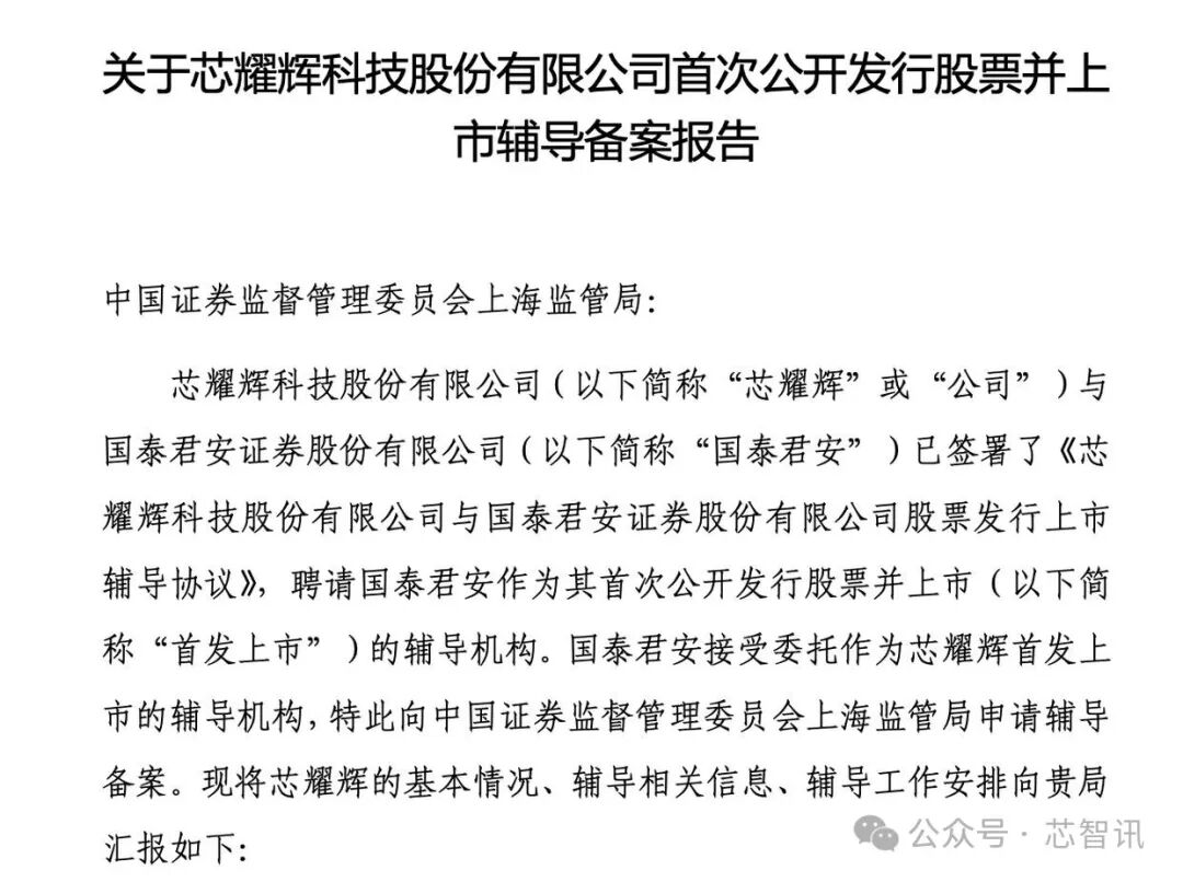 值得一提的是,今年3月28日,芯耀辉与国泰君安签署了《芯耀辉科技股份有限公司与国泰君安证券股份有限公司股票发行上市辅导协议》,聘请国泰君安作为其首次公开发行股票并上市的辅导机构。国泰君安接受委托作为芯耀辉首发上市的辅导机构,于4月10日向中国证券监督管理委员会上海监管局申请辅导备案。