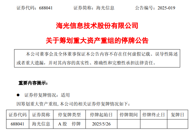 2025年5月25日,上海证券交易所主板上市公司曙光信息产业股份有限公司(股票代码:603019.SH)与科创板上市公司海光信息技术股份有限公司(股票代码:688041.SH)共同宣布,两家公司拟进行战略重组。若相关工作顺利推进,将实现产业链相互补充,进一步促进信息产业龙头企业发展,对信息产业格局产生较大影响。