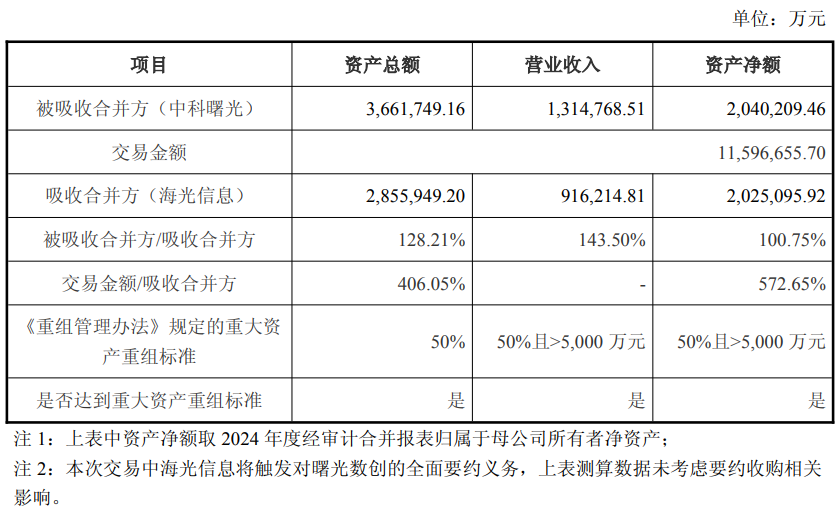 《重组预案》显示,参与本次换股的中科曙光股票为14.63亿股,若不考虑合并双方后续可能的除权除息等影响,按照换股比例1:0.5525计算,海光信息为本次换股吸收合并发行的股份数量合计为8.08亿股。吸收合并方换股价格为143.46元/股,被吸收合并方换股价格为79.26元/股。本次换股吸收合并中,海光信息拟购买资产的交易金额为换股吸收合并中科曙光的成交金额(交易金额=中科曙光换股价格×中科曙光总股本),为1159.67亿元。