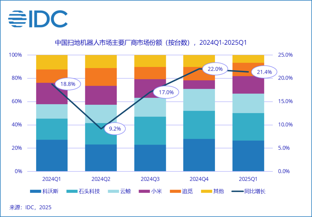 从中国市场来看,2025 年第一季度中国扫地机器人市场出货 118.8 万台,同比增长 21.4%,出货量增长率连续 2 个季度超过 20%。品牌排名方面,Top厂商分别为科沃斯、石头科技、云鲸、小米、追覓。