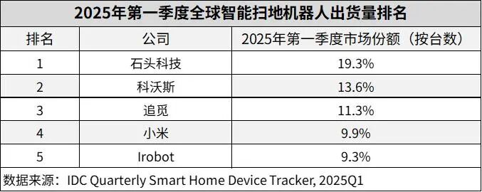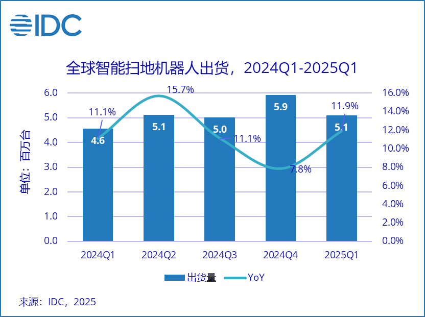 6月19日,市场研究机构IDC最新发布的《全球智能家居设备市场季度跟踪报告》显示,2025年一季度全球智能扫地机器人市场出货509.6万台,同比增长11.9%。出货量增长率连续两个季度超过20%。