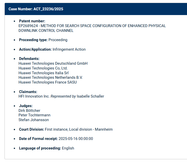 当地时间6月18日,欧洲统一专利法院(UPC)曼海姆(Mannheim)分庭更新的最新诉讼信息,联发科子公司HFI Innovation起诉了中国华为旗下五家子公司侵犯了欧洲专利EP2689624,这是一项名为“增强型物理下行链路控制信道的搜索空间配置方法”的LTE专利。这是联发科对于此前华为起诉联发科专利侵权的进一步回应。
