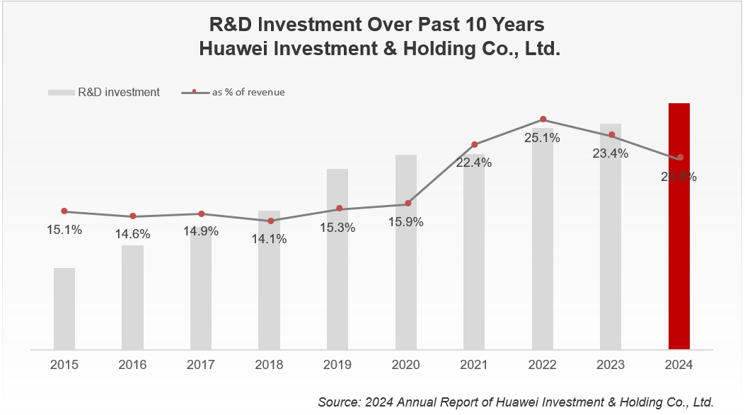 在华为大量专利产出的背后,更是离不开华为在研发领域的持续的大手笔的投入。华为年报显示,华为2024年研发投入达到 1,797 亿元人民币,约占全年收入的 20.8%,近十年累计投入的研发费用超过 12,490 亿元人民币。