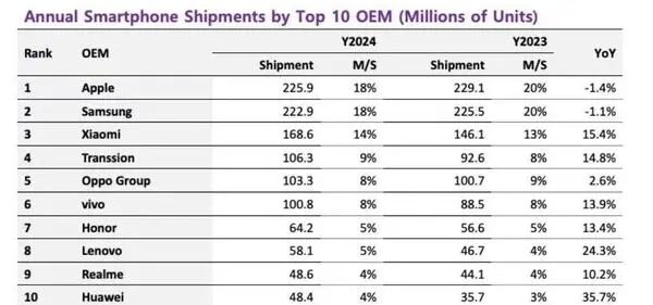 市场研究机构Canalys发布的2024年全年中国大陆智能手机市场出货数据显示,荣耀以接近15%的市场份额,位居国内市场第五,市场竞争日趋激烈。如果从全球市场来看,另一组第三方统计数据显示,2024年荣耀在全球市场的销量份额仅有5%,排名第七。而随着近两年来,华为手机业务逐步恢复后,其在全球市场的份额已经升至4%,这在一定程度上也影响了荣耀原有的用户市场。