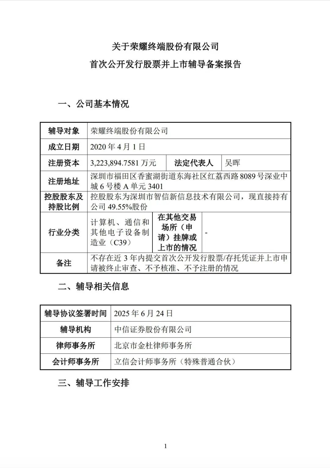 根据证监会官网信息显示,6月26日,国产手机品牌厂商——荣耀终端股份有限公司(以下简称“荣耀”)获上市辅导备案,辅导券商为中信证券。根据辅导工作安排,预计将于2026年1月至3月完成上市辅导。
