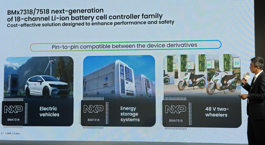 中国大连——2025年7月2日——恩智浦半导体(NXP Semiconductors N.V.,纳斯达克股票代码:NXPI)日前推出全新18通道锂电池电芯控制器BMx7318/7518系列IC产品,专为电动汽车高压电池管理系统(HVBMS)、工业储能系统(ESS)及48V电池管理系统设计。该系列基于恩智浦先进的每通道独立模数转换器(ADC)架构设计,提供灵活多样的型号选择及跨型号引脚兼容性,为客户提供高性价比解决方案,同时改进总体电池管理系统性能。新IC产品系列同时满足汽车ASIL-C与工业SIL-2功能安全认证。