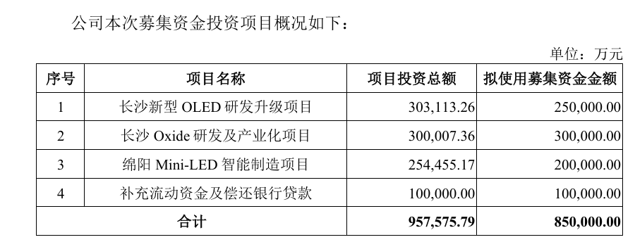 惠科股份此次IPO拟募资85亿元,25亿元投建于长沙新型OLED研发升级项目、30亿元投资于长沙Oxide研发及产业化项目、20亿元投建于绵阳Mini-LED智能制造项目、10亿元用于补充流动资金及偿还银行贷款。