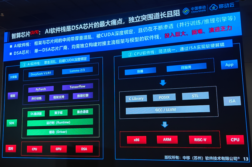 刘亚南解释称,AI软件栈和CPU软件栈是完全不一样的,AI软件栈厚重混乱,且被CUDA深度绑定,并且仍在不断进行渗透。而CPU软件栈简单统一,通过ISA实现软硬解耦。当前AI栈的问题是烟囱式重复、云化困难,芯片厂商演进负担重。包括GPU和DSA芯片厂商,它们都需要独立构建对接主流框架与模型的AI软件栈,AI软件栈和上层框架对接,和DL编译器、算子库对接的都要做一遍,运行的驱动均需要自己开发和维护,整体来说,投入巨大、演进也比较困难。