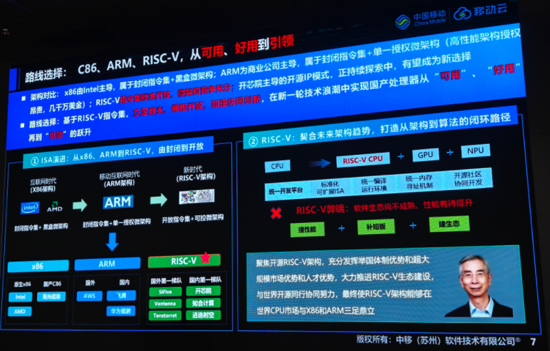 那么,中国移动为什么要选择RISC-V呢?众所周知,X86是封闭架构,由英特尔和AMD主导,其指令集是“黑盒”;Arm架构则是由Arm公司主导,属于封闭指令集+单一授权微架构,仅对少数厂商开放Armv8指令集授权,且费用较高,后续指令集升级需要重新授权;RISC-V刚好是相反的,指令集完全开放,微架构竞争充分。