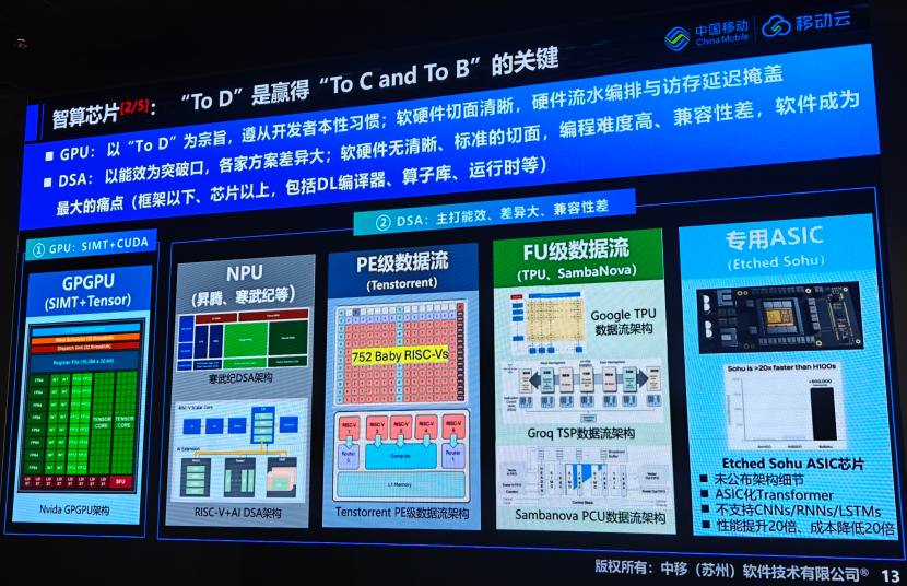 而从智算芯片的架构来看,目前主要有:主流的通用的GPU/GPGPU架构;主打能效核定制化的DSA(domain specific architecture,领域专用架构),包括NPU(比如华为昇腾、寒武纪)、PE级别数据流(Tenstorrent)、FU级数据流(比如,谷歌TPU)、专用ASIC,但是这类芯片编程难度高、兼容性差,软件成为最大的痛点。