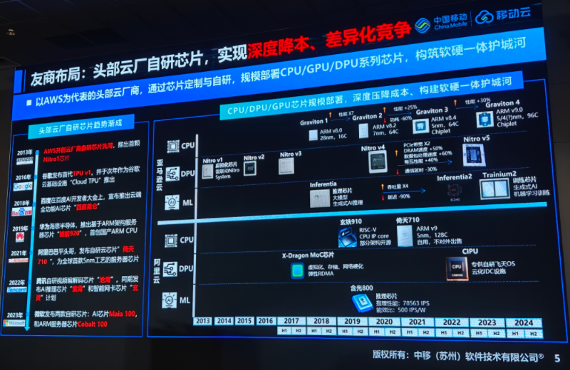 目前亚马逊、谷歌、阿里巴巴、华为、百度、腾讯、微软等众多的云巨头都有在定制/自研芯片,并进行规模部署,以实现深度降本,实现差异化竞争。“云计算已经进入淘汰赛,定制与自研芯片,将成为核心竞争力。”刘亚南说道。