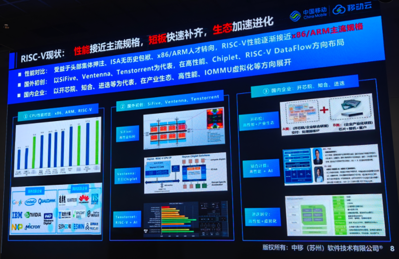 刘亚南进一步指出,今年4月,还有传闻称工信部牵头八部委发了一个鼓励在在全国推广RISC-V的文件。中国移动董事长杨杰也在各种场合表示要支持做软硬件的融合创新。当然我们中国移动做科技创新,更多是通过产业链协同来引领和协助大家做芯片和软硬件结合的创新。在地方层面,主要是北京和上海比较积极,比如北京有开芯院,上海有开放处理器产业创新中心。