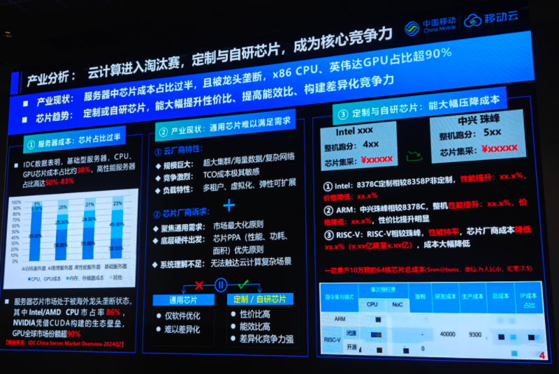 据刘亚南介绍,定制的Intel 8378C相较非定制的8358P,性能可以提升个位数百分比,成本则可以降低两位数百分比;如果用基于Arm架构的中兴珠峰处理器,相比定制的Intel 8378C,整机性能可以提升两位数百分比,价格也可以降低两位数百分比,性价比提升明显;如果采用RISC-V架构的服务器处理器,相比中兴珠峰,还能够带来两位数百分比的成本降低。