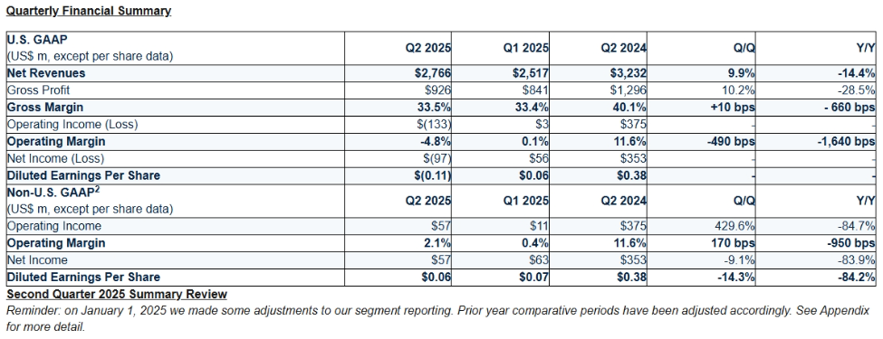 财报显示,意法半导体2025年第二季(截至2025年6月28日)营收同比下滑14.4%至27.6亿美元,高于财测区间及分析师预估值。然而,因应销售下滑的困境,意法半导体于今年4月启动重组计划,认列相关重组成本与减损损失达1.9亿美元,导致第二季营业亏损1.33亿美元。若不计入上述重组支出和减损,第二季调整后营业利益为5,700万美元,符合分析师预期。