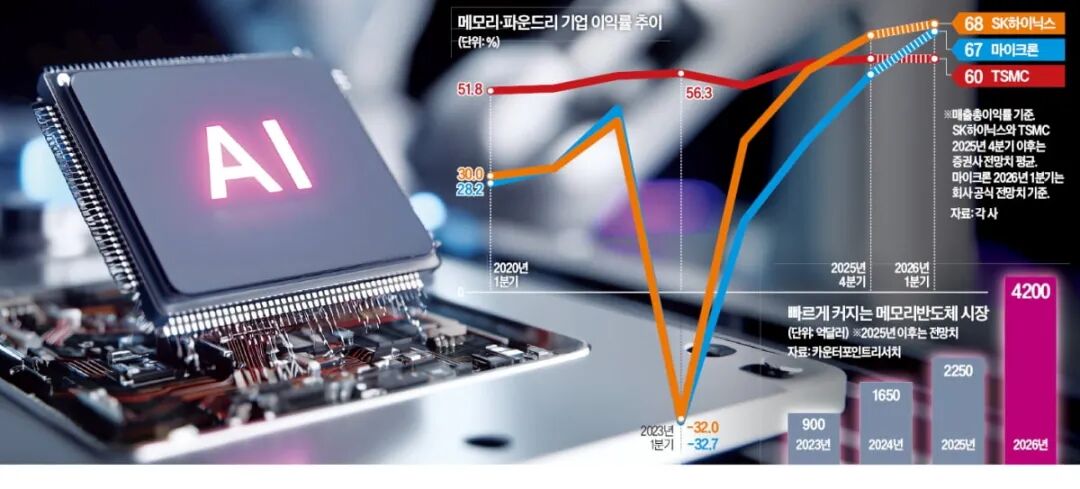 12月23日消息,随着人工智能需求快速攀升,存储芯片价格大幅上涨,半导体产业的获利结构正出现变化。据《韩国经济新闻》报道,预计三星电子的存储部门与SK 海力士在2025年第四季度的毛利率将超越台积电,这将是自2018年第四季度以来,存储产业的利润表也现首次超过晶圆代产业。