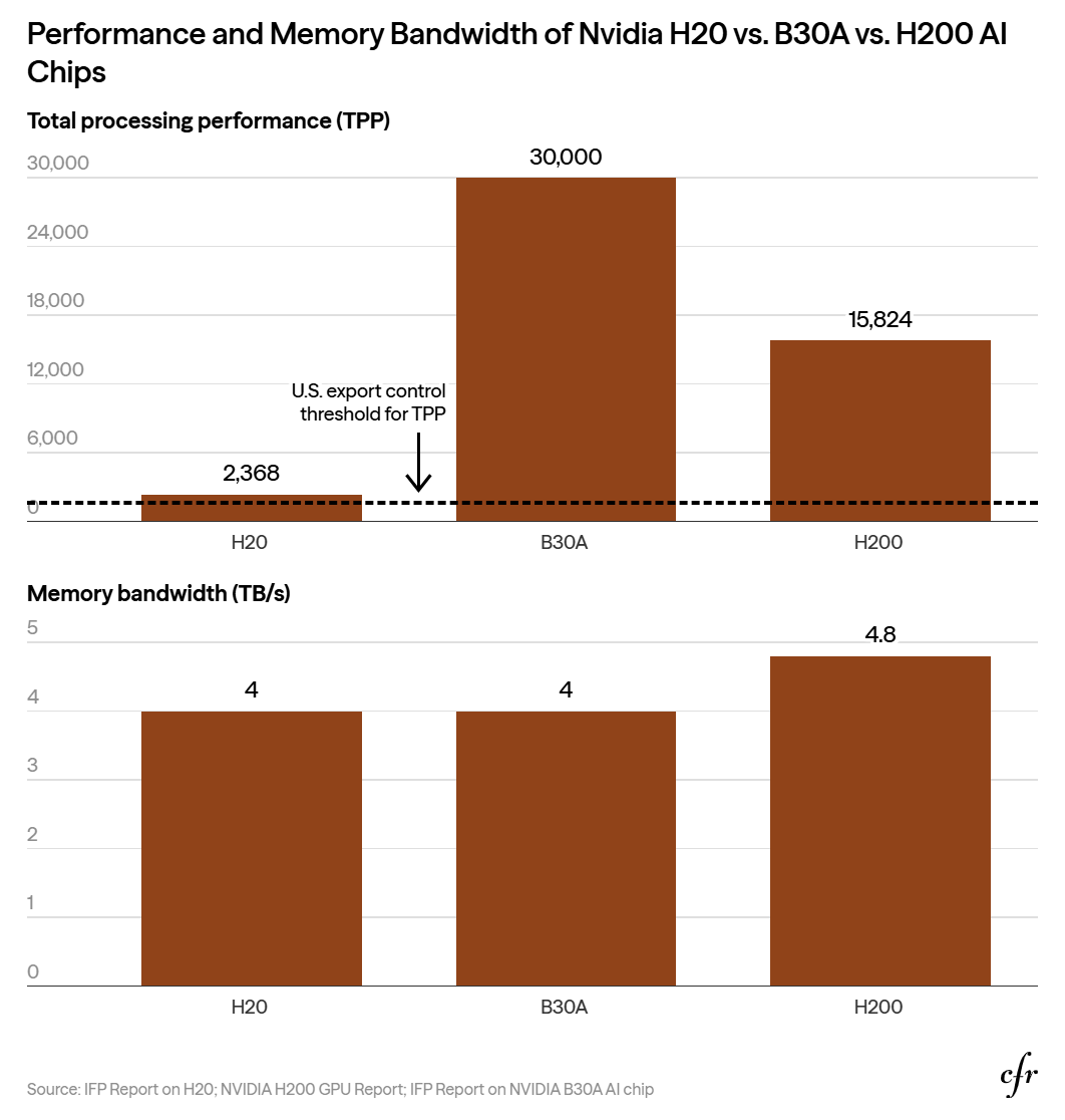 △英伟达H20与B30A与H200 AI芯片的性能和内存带宽对比