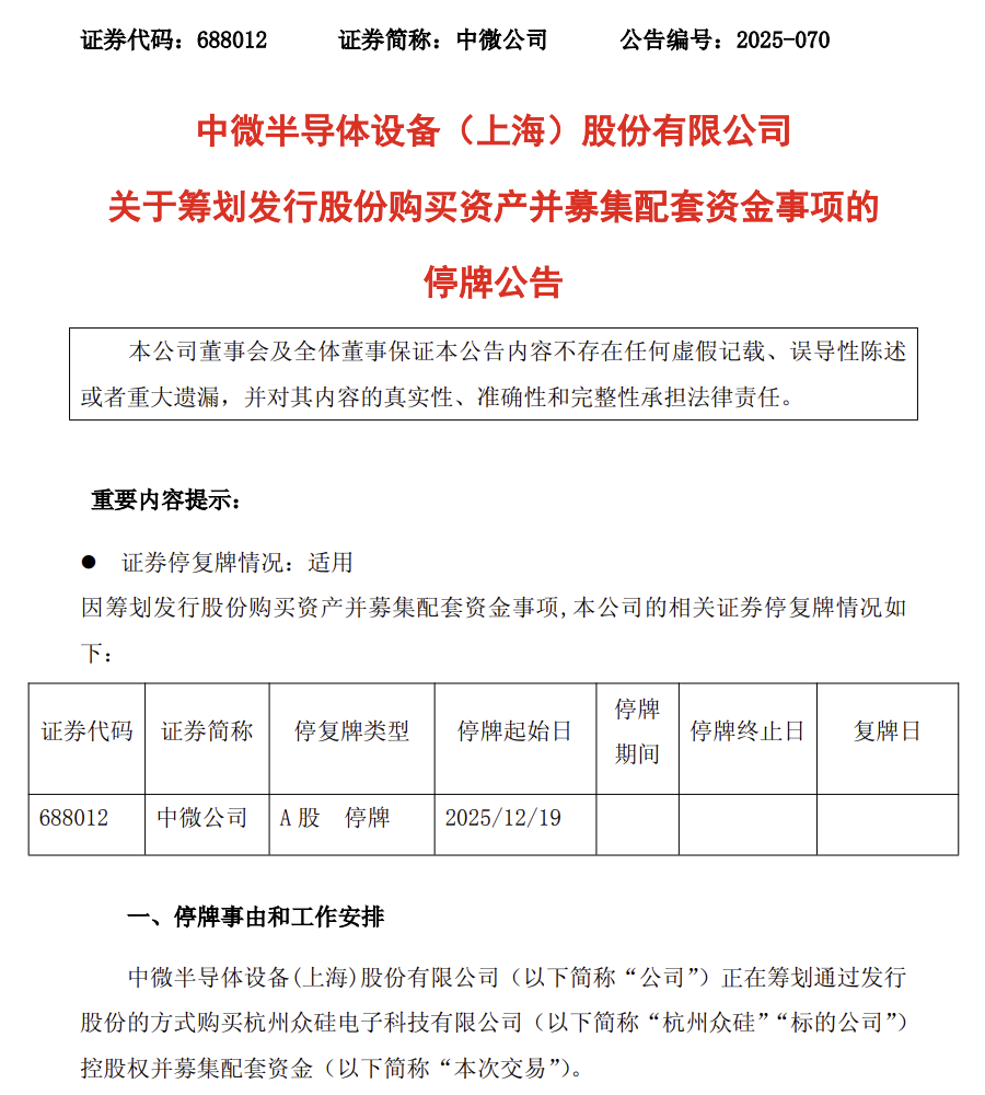 12月18日晚间,国产半导体设备厂商中微公司发布公告,宣布拟发行股份收购国产CMP设备厂商杭州众硅电子科技有限公司(以下简称“杭州众硅”)控股权,并募集配套资金。股票自2025 年12 月19 日(星期五)开市起开始停牌,预计停牌时间不超过 10 个交易日。