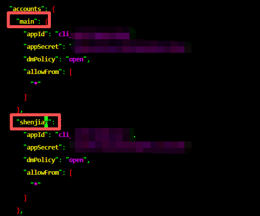 比如我的OpenClaw,有main账号,有shenjian账号,还有default账号,每个账号对应一个飞书机器人,形成自己的机器人军团。