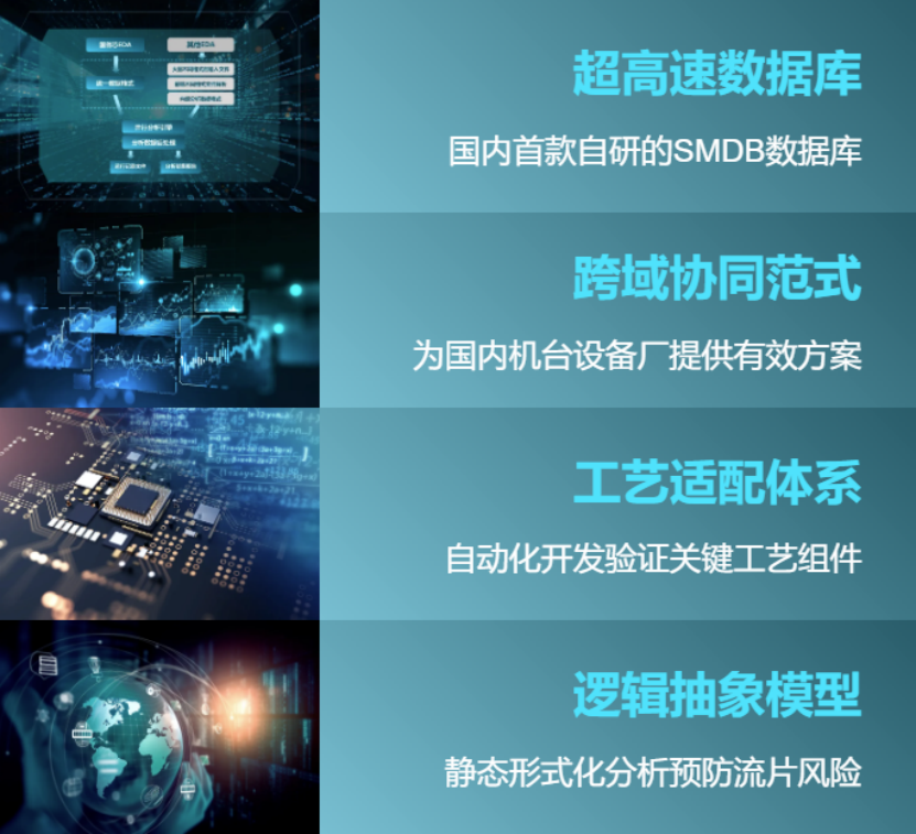 四大技术引擎协同咬合,形成从原子级数据处理(SMDB)到系统级流程优化(DTCO)的完整技术链,为国产EDA构建自主可控的底层架构。