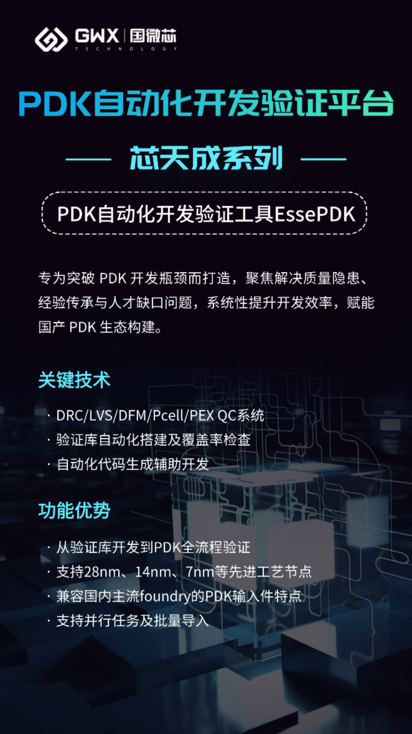 国微芯EssePDK基于深厚行业经验形成的方法论,直击PDK开发效率与质量方面的痛点,提供PDK组件全流程验证系统、PDK设计流程验证系统、验证库自动生成系统及代码辅助开发系统等,用于实现PDK开发的全面自动化及验证,从而帮助国内晶圆代工厂构建一套高效且精确的标准化PDK开发验证体系。