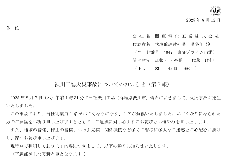 当地时间8月12日,关东电化工业株式会社(Kanto Denka Kogyo Co.,Ltd.)发布公告称,今年8月7日凌晨 4 时 40 分,其位于日本群马县涩川市的三氟化氮(NF₃)生产设施发生爆炸及严重火灾,造成一名工人死亡,另一名工人受伤。火势于当日上午8时45分被完全扑灭。
