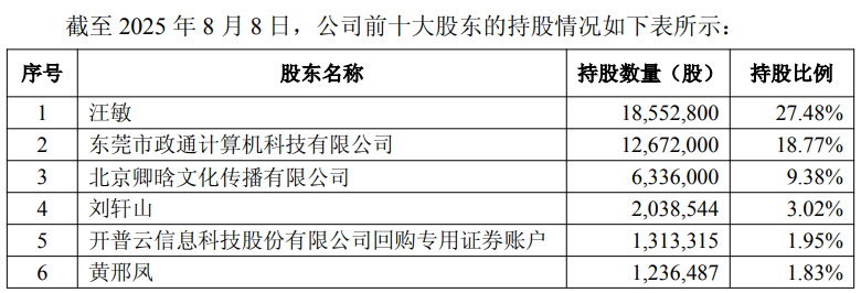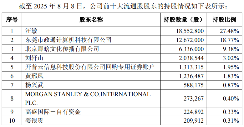 开普云 A 股停牌前一个交易日(2025 年 8 月 8 日)前十大股东的名称及持股数量、前十大流通股股东的名称及持股数量披露如下: