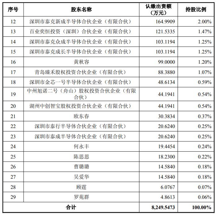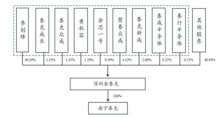 李创锋之配偶黄秋容直接持有深圳金泰克 99.00 万股股权,占比1.20%,黄秋容通过深圳市金芯一号半导体合伙企业(有限合伙)、深圳市聚泰众成半导体合伙企业(有限合伙)、深圳市泰克新成半导体合伙企业(有限合伙)、深圳市泰成半导体合伙企业(有限合伙)及深圳市泰行半导体合伙企业(有限合伙)间接控制深圳金泰克股份占比合计 7.22%。