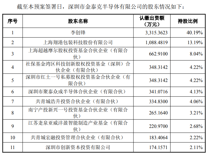 截至本预案签署日,李创锋为深圳金泰克公司的控股股东、实际控制人。李创锋直接持有深圳市金泰克半导体有限公司3,315.36 万股股权,占比40.19%。此外,李创锋还通过深圳市泰克成长半导体合伙企业(有限合伙)、深圳市泰克众成半导体合伙企业(有限合伙)间接控制深圳金泰克股份占比合计2.50%。李创锋个人直接及间接控制深圳金泰克42.69%股权。