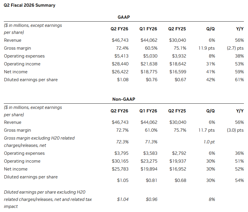 Non-GAAP准则下调整后的每股收益(EPS)为1.05美元,同比增长54%,环比增长30%,略高于分析师预期的1.01美元。若剔除H20相关费用等影响,二季度EPS为1.04美元,环比增长8%。