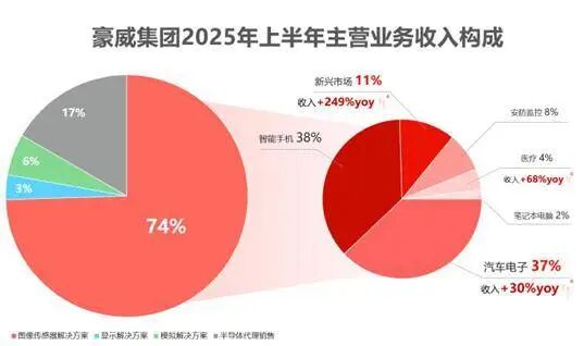 具体来说,豪威集团2025年上半年的图像传感器总营收当中,来自汽车电子营收同比增长30%,营收占比高达37%,已经几乎与最大营收来源——智能手机市场的38%份额持平。