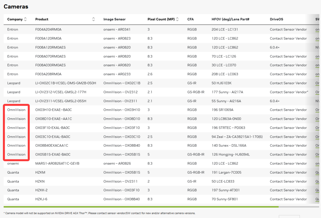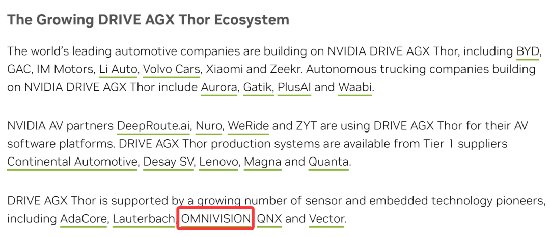 而在这篇新闻稿当中,英伟达对于DRIVE AGX Thor 生态系统介绍时就指出:“DRIVE AGX Thor 得到了越来越多的传感器和嵌入式技术先驱的支持,包括AdaCore、Lauterbach、OMNIVISION(豪威集团)、QNX和Vector。”