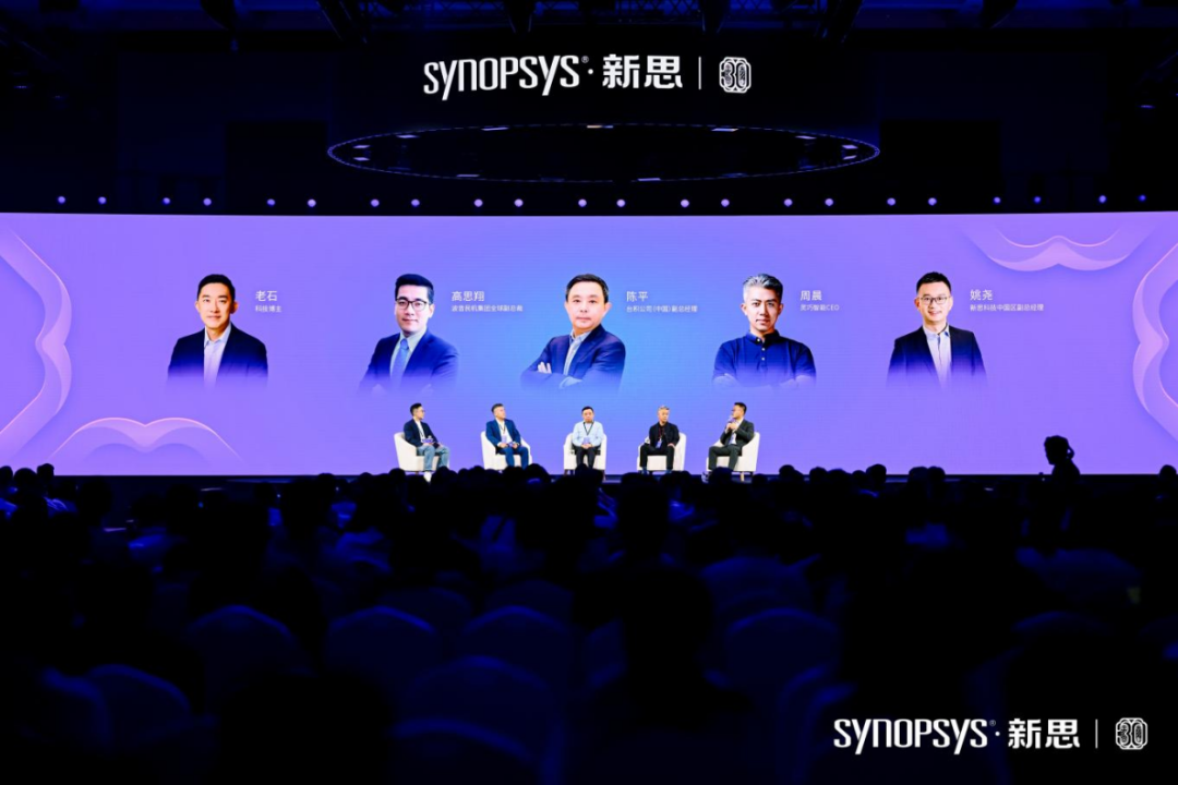 会上还展开了技术创新从探索到落地的高峰论坛。由知名科技博主老石主持,台积公司(中国)副总经理陈平、波音民机集团全球副总裁高思翔、灵巧智能CEO周晨、新思科技中国区副总经理姚尧参与了此次讨论。