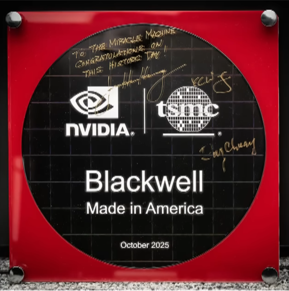 在庆祝活动的舞台上,黄仁勋与台积电运营副总裁王永利一起在Blackwell晶圆上签名,以纪念这一个里程碑,展示了人工智能基础设施的核心引擎现在是如何在美国构建的。