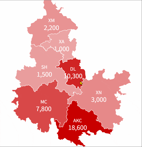 第二、交互上得到提升。我们可以为默认、悬停、按下设置不同的SVG度量值。比如默认是着色地图展示业绩,鼠标悬停地图切换为环形迷你图效果,展示业绩达成: