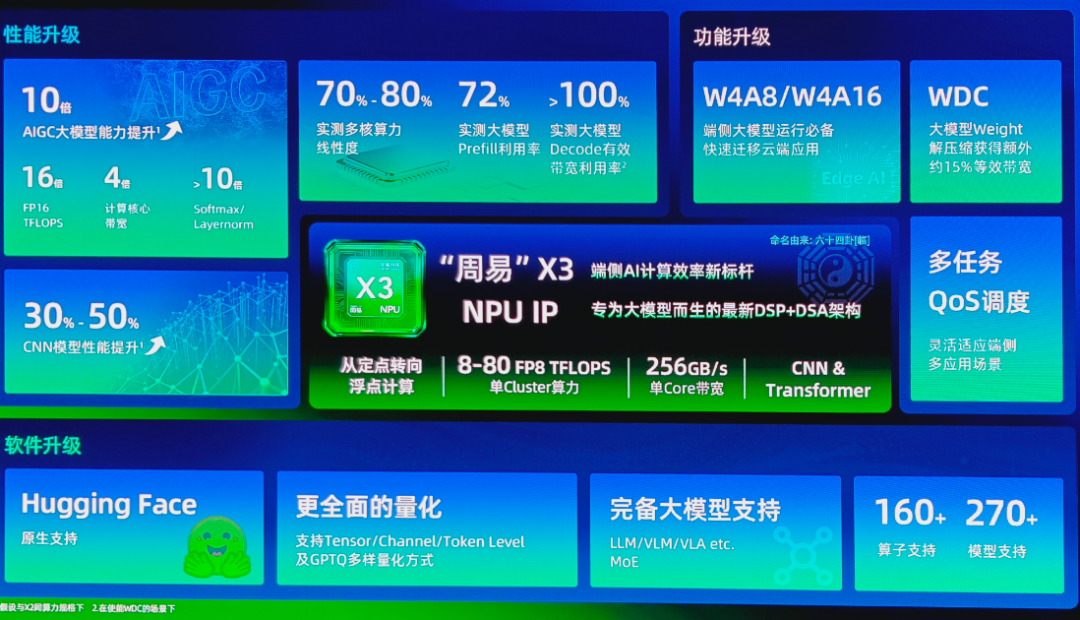 “周易”X3基于专为大模型而生的最新DSP+DSA架构(DSP兼顾了通用计算与专业加速的向量计算能力、DSA架构则拥有更大算力和支持更多精度的矩阵计算),从计算效率、带宽、精度适配、任务处理四大维度实现升级,精准解决端侧AI大模型运行难题,打造端侧AI计算效率的新标杆。