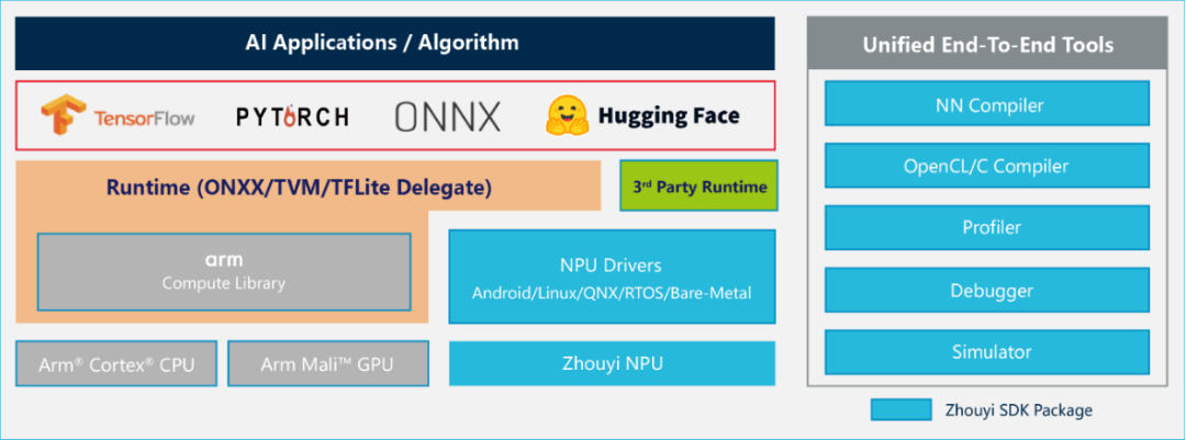 ●全面的系统与异构兼容:支持Android、Linux、RTOS、QNX等多种操作系统,并通过TVM/ONNX实现SoC异构计算,高效调度CPU、GPU、NPU等计算资源。