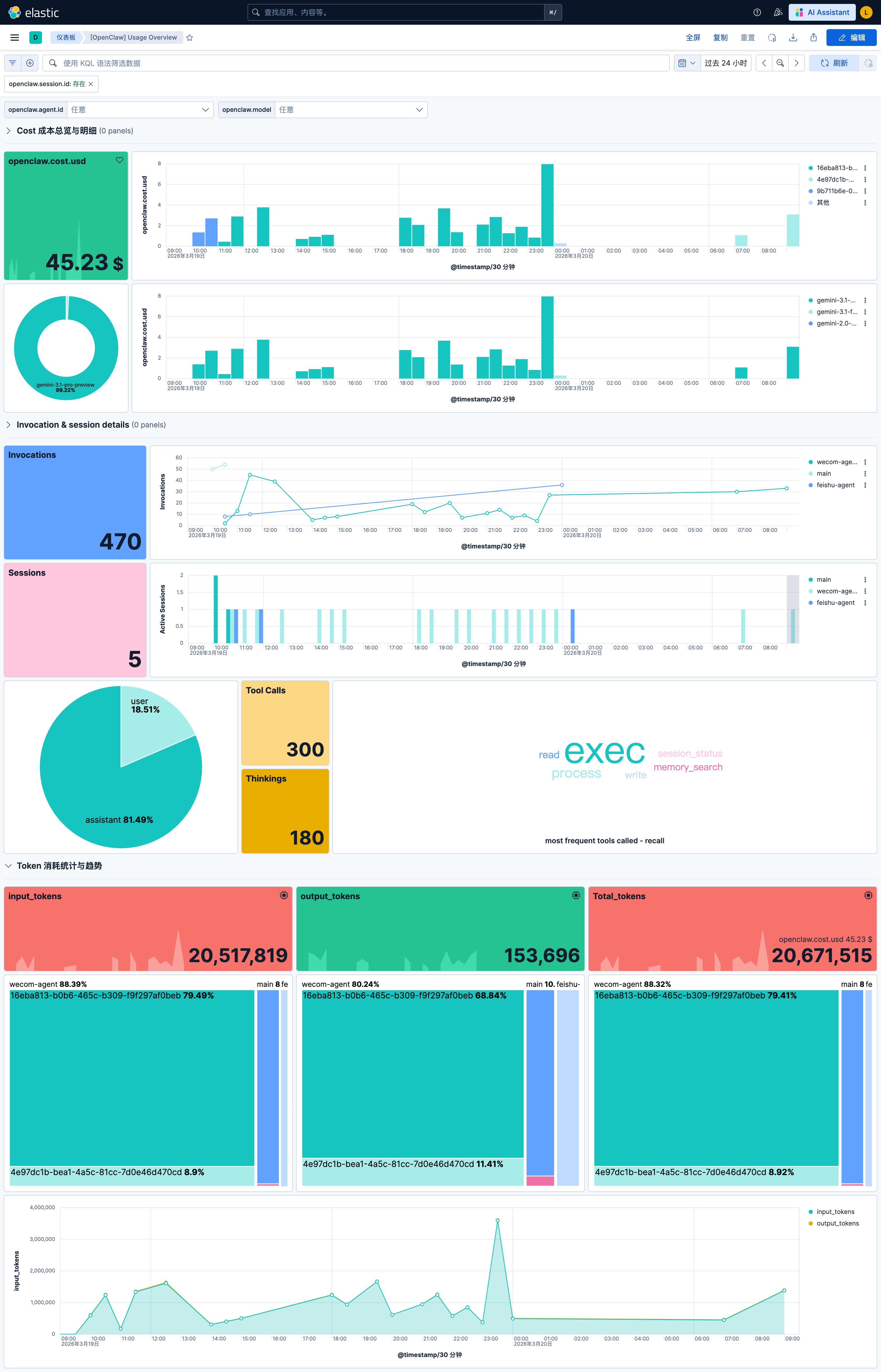 我们将手把手演示:如何从零构建一个标准的 Elastic Integration 包,将 OpenClaw 的底层日志转化为 Kibana 里高大上的 LLM Observability(大模型可观测性)大屏仪表板,实现从采集、清洗到可视化的“一条龙服务”。