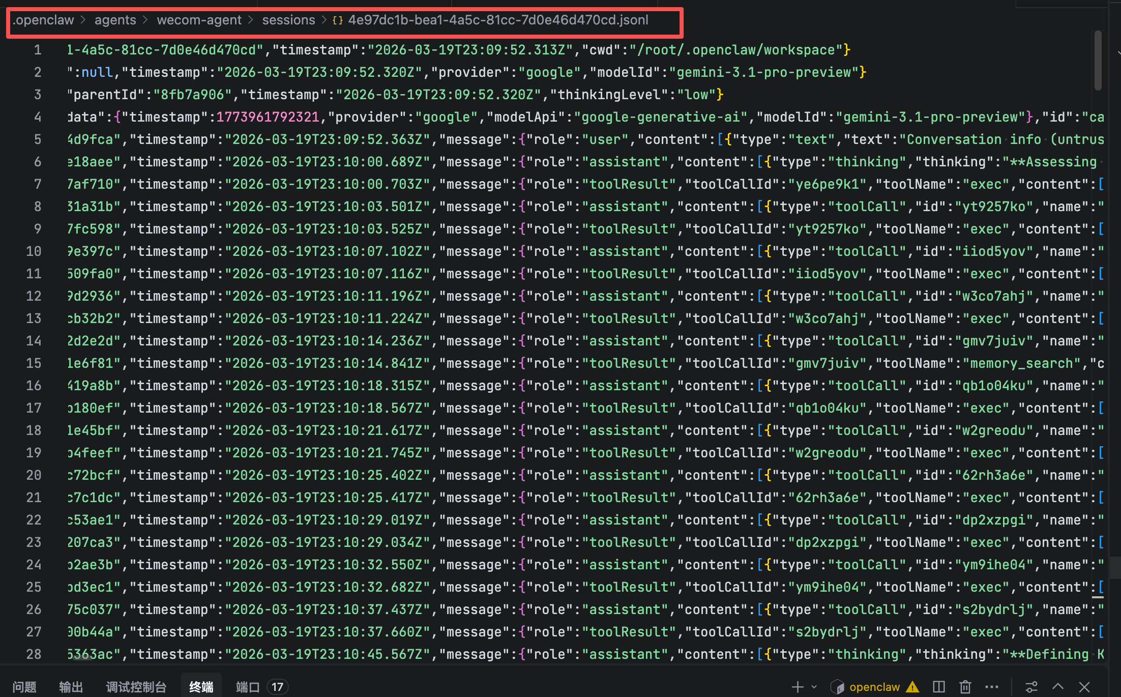 在 OpenClaw 中,所有的会话持久化都在 ~/.openclaw/agents/main/sessions/ 目录下。每一个 Session 是一个独立的 .jsonl 文件。