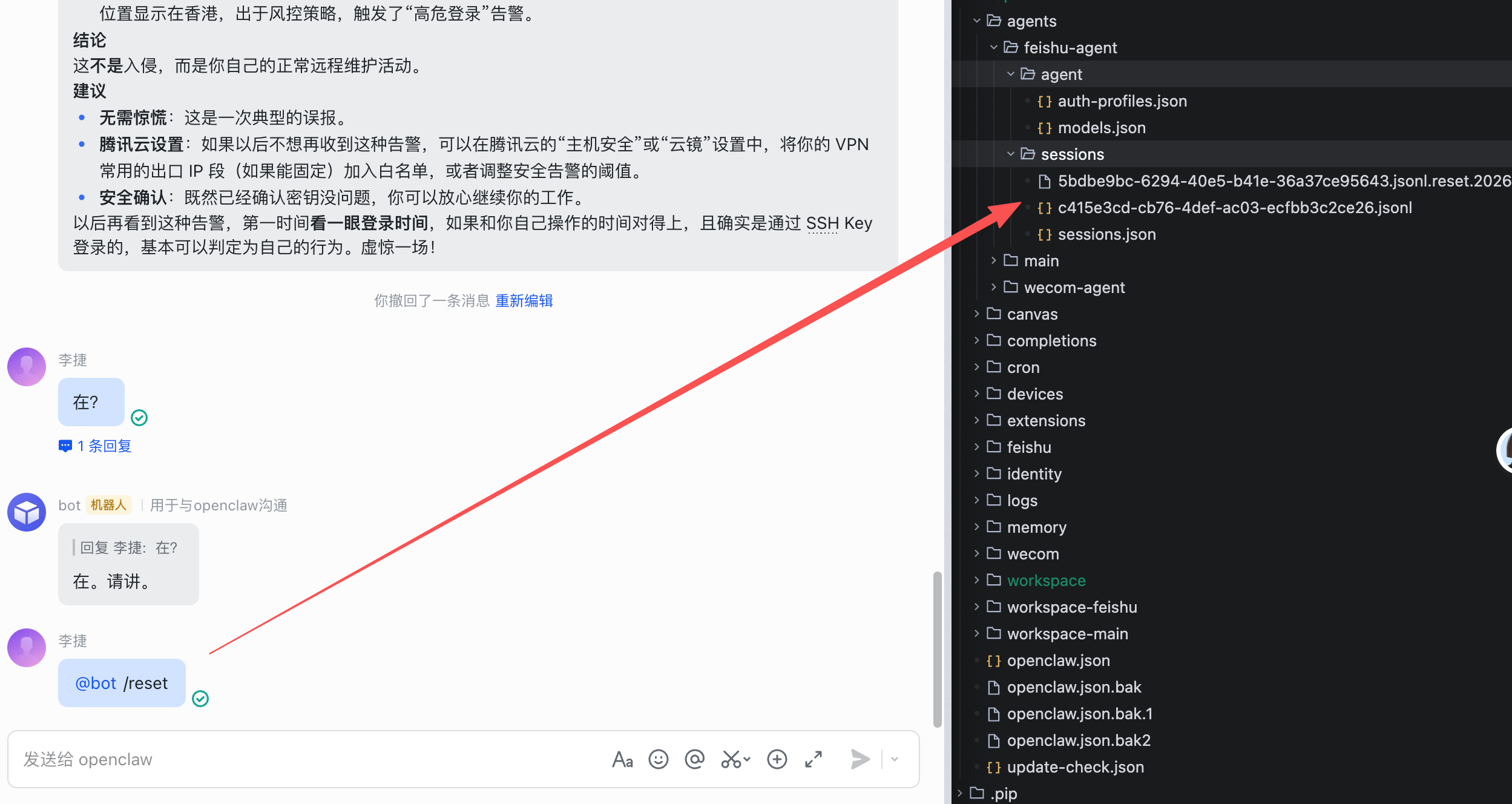 当你敲下 /reset 时,OpenClaw 并不是简单地清空前端页面。它会在 Linux 文件系统中,将当前的 uuid.jsonl 文件重命名备份为 uuid.jsonl.reset.2026-03-20T10-00-00Z,并立刻为你生成一个全新的 Session ID 和空白的 .jsonl。