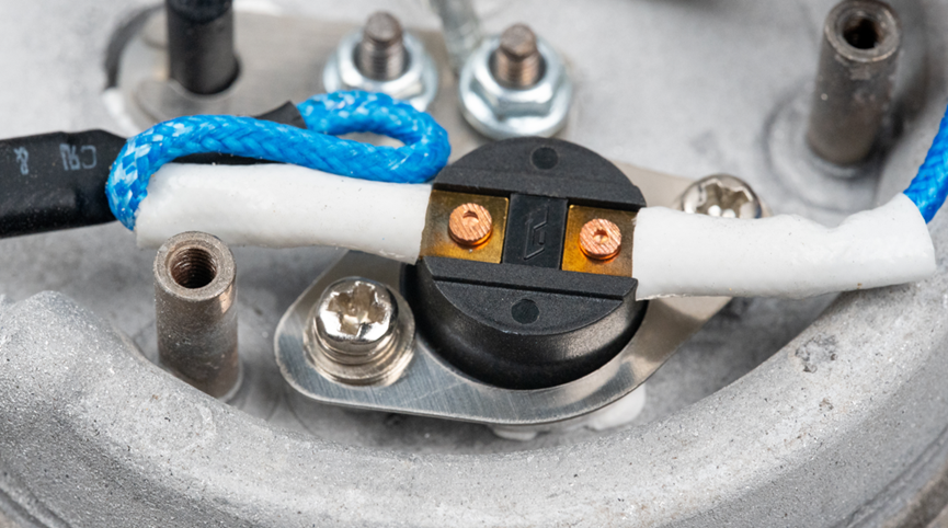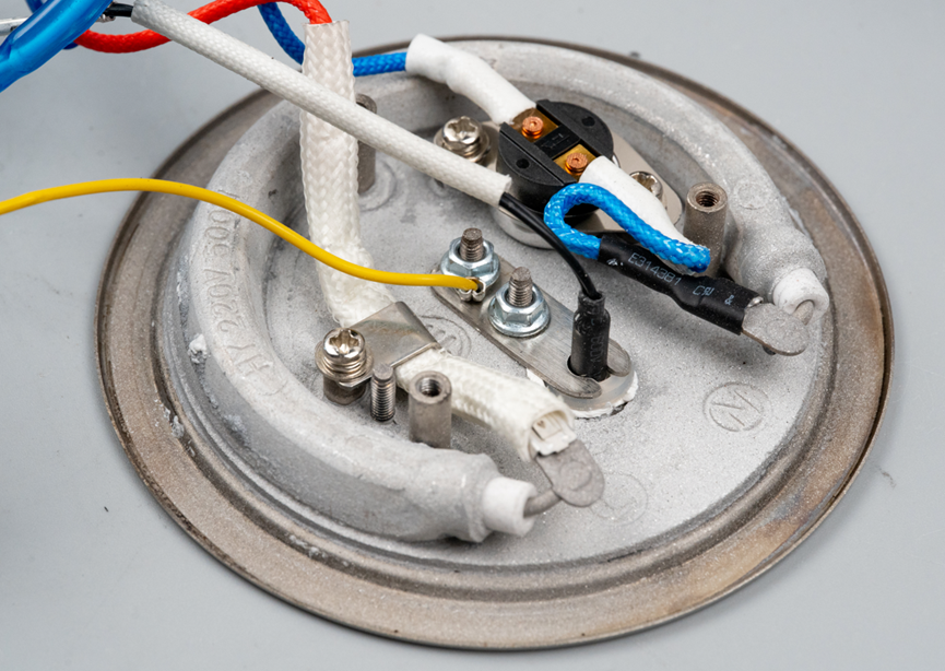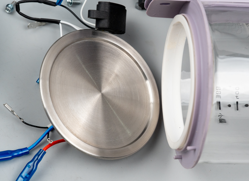 加热盘上还安装有一个温度保护保险丝,这是一个安全保护部件,当烧水壶内的水温过高,或者出现干烧情况时,温度保护保险丝会自动断开电路,停止加热,避免设备损坏或引发安全事故。