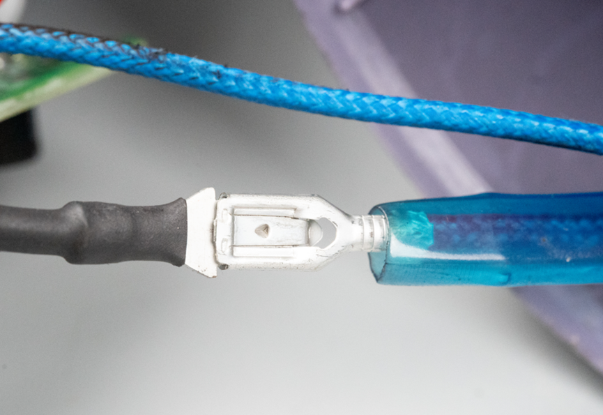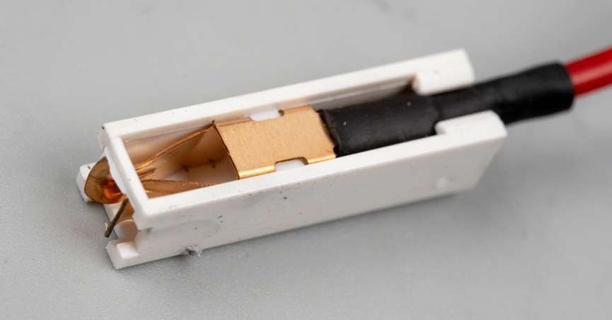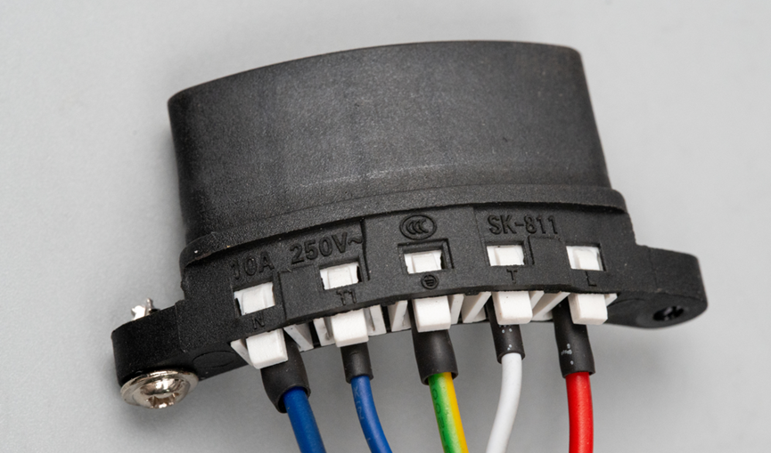 每一根线束都连接到一个专用端子上,这种端子类似大号的杜邦线,便于接线和拆卸,之后再将所有端子统一插入那个黑色的弧形塑壳中,组成完整的连接器。