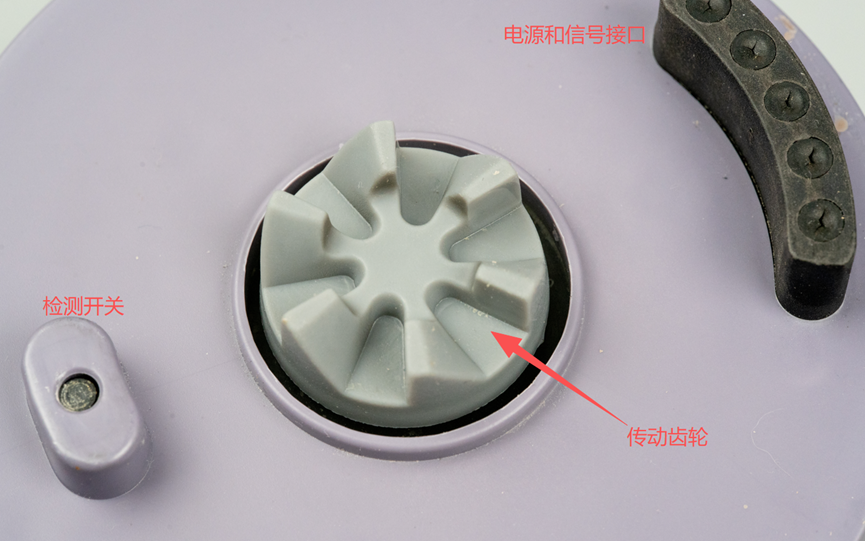 底座的平面上分布着三个关键部件:左侧是适配检测开关,主要作用是判断是否有配套套件放置到位;中间的是传动齿组,工作时可带动上方破壁机内部的刀片高速旋转;右侧那个黑色部件则是电源与信号接口,负责供电和信号传输。