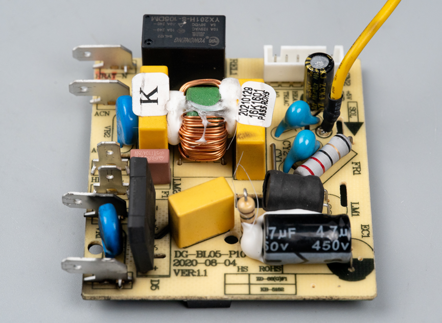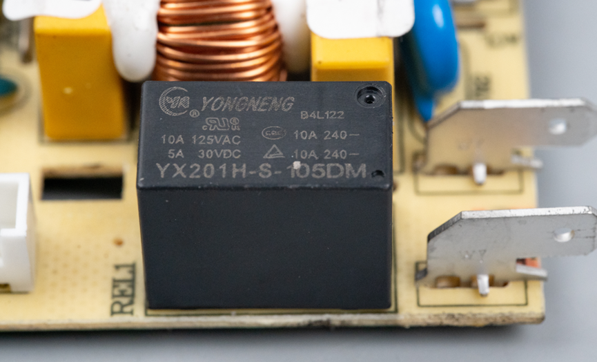 电路板上还安装有一个继电器,它的主要功能是控制电机电路的通断,相当于一个“电子开关”,接收控制板的信号后,实现电机的启动和停止。
