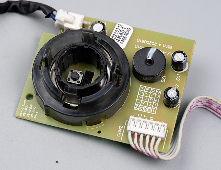 控制主板的正面为单面板设计,正面分布着旋钮旋转机构、操作按键、蜂鸣器、电容以及排线连接器等部件,各类部件布局合理,便于安装和维护。