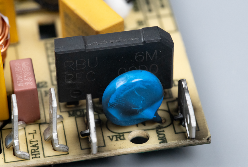 这是整流桥的细节特写,整流桥的主要作用是将输入的交流电转换为直流电,为电机和其他电子部件供电。