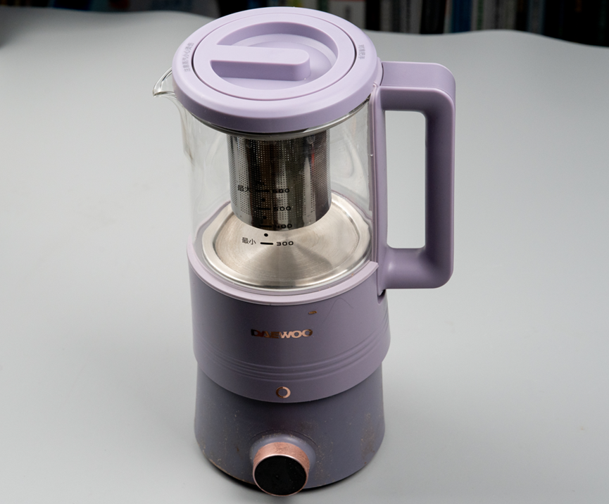 接下来拆解配套的烧水壶,这款烧水壶的外壁采用玻璃材质制成,便于观察水位变化,底部则是金属材质,用于实现加热功能。
